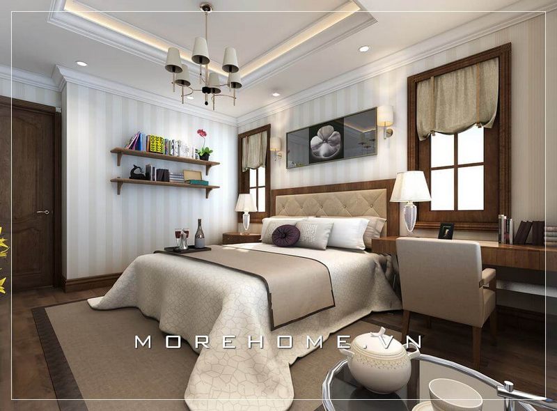 Thiết kế nội thất giường ngủ gỗ công nghiệp tinh tế, gam màu nâu nhẹ kết hợp những tone màu nhã nhặn phù hợp với không gian phòng ngủ của người lớn tuổi như phòng ngủ ông bà