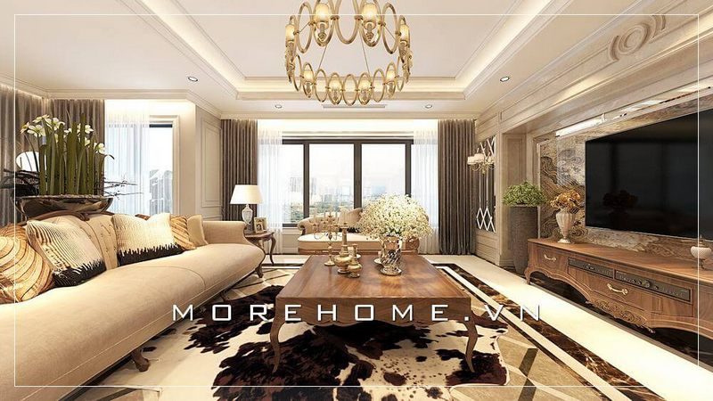 Phòng khách chung cư ấn tượng và nổi bật hơn với chiếc kệ ti vi tân cổ điển tạo nên sự hòa hảo cho không gian tiếp khách